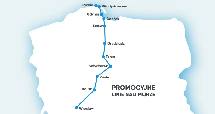 Karwia, Jastrzębia Góra, Władysławowo, Puck, Reda, Rumia, Gdynia, Sopot, Gdańsk, Nowy Dwór Gdański, Elbląg, Pasłęk, Ostróda, Olsztyn, Biskupiec, Mrągowo, Mikołajki, Orzysz, Ełk, Augustów, Suwałki* >>